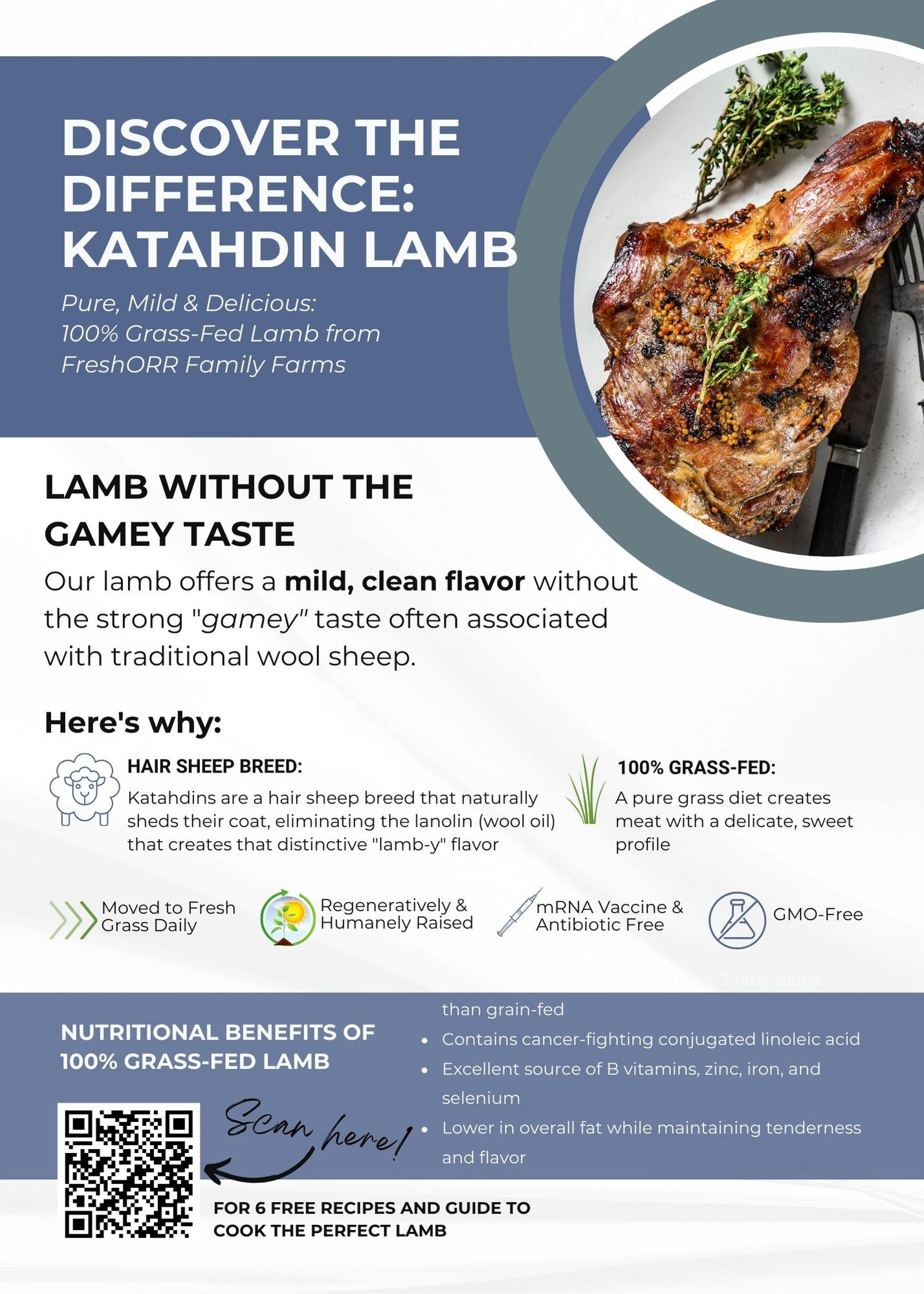 LAMB WITHOUT THE GAMEY TASTEOur lamb offers a mild, clean flavor without the strong "gamey" taste often associated with traditional wool sheep.